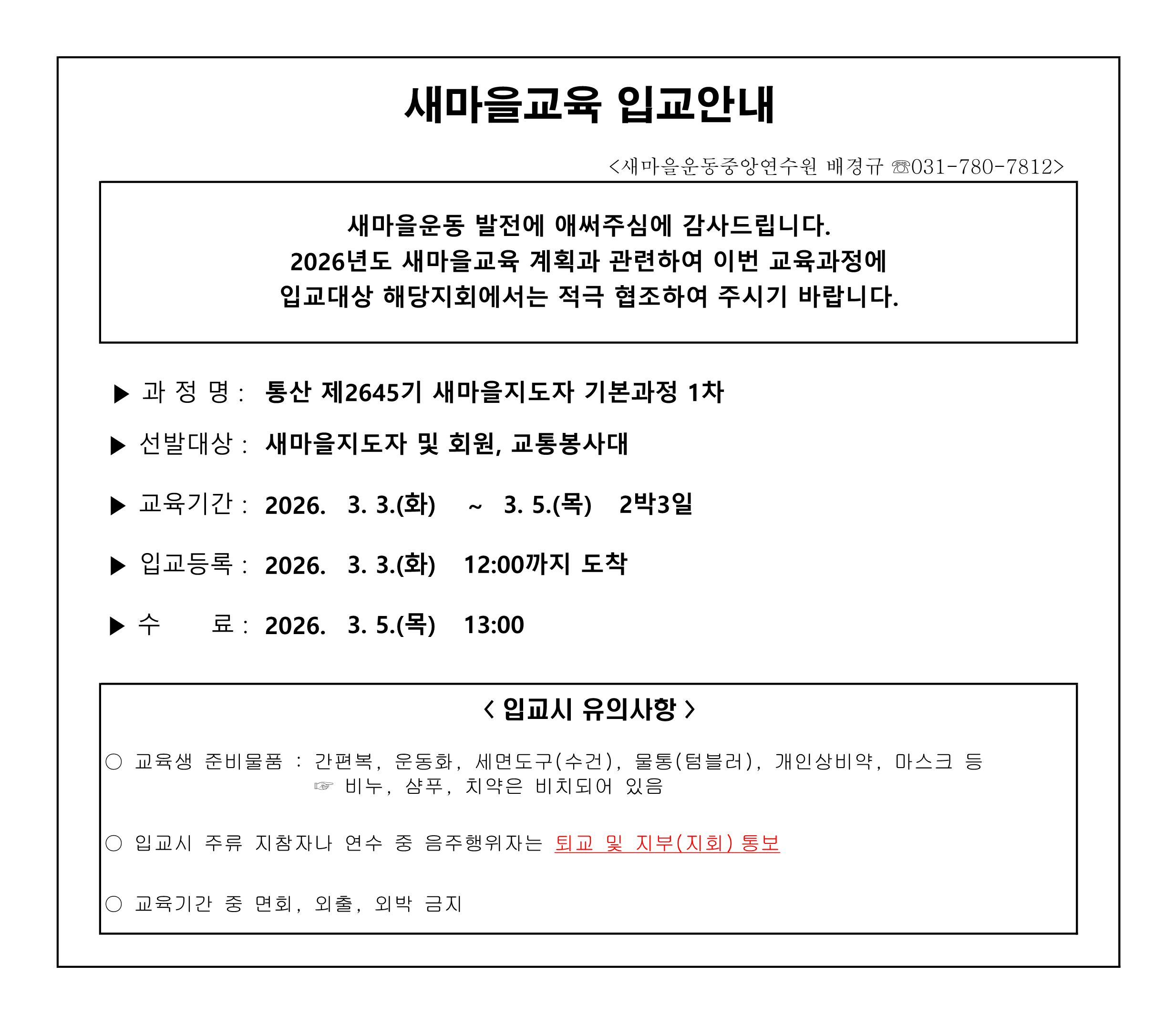 2026. 3. 3 ~ 3. 5 새마을지도자 기본과정 1차 입교안내