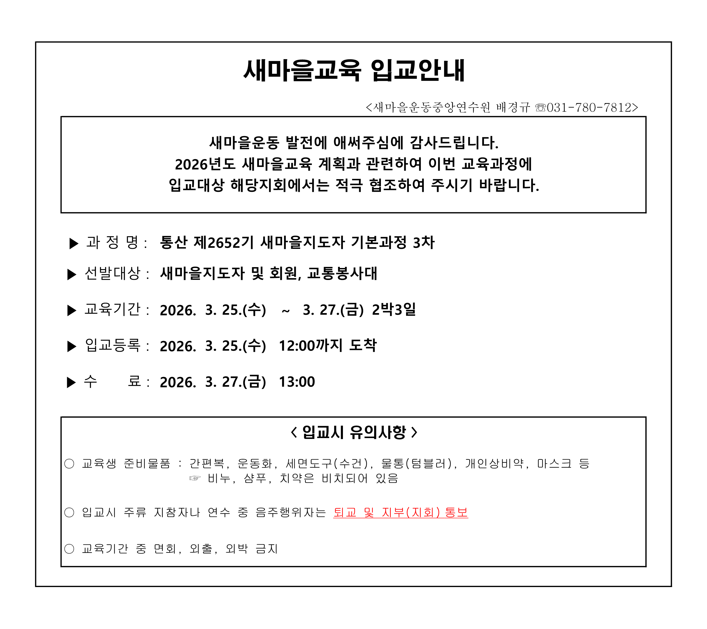 2026. 3. 25 ~ 3. 27 새마을지도자 기본과정 3차 입교안내